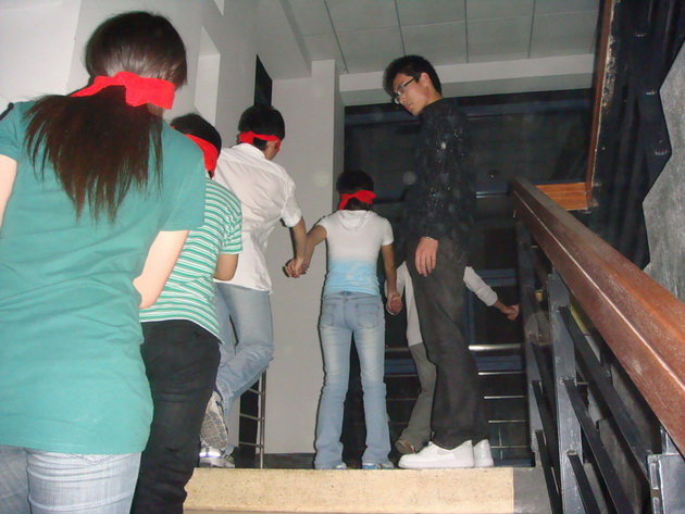 室外活动设置了走楼梯项目,志愿者牵手蒙眼前进,所有的感官信息完全来自于双手的牵引和脚下的摸索。