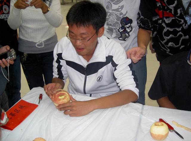 饺子宴的场地被一个个红灯笼装饰着,呈现欢乐祥和的气象。与单纯意义上的吃饺子不同,这次活动开设了许多有趣的小比赛。大一的新生以班为单位分成七组,依次参加包饺子,削苹果与吃饺子比赛。参赛同学各个跃跃欲试,使出浑身解数,比个数,比长度,一展身手。观战的同学不断给他们加油,鼓劲,场面相当得激烈。在蛋糕设计环节中,同学们靠合作,靠默契,靠创意,展现出超强的动手能力和90后人独特的创新意识。