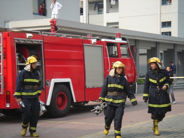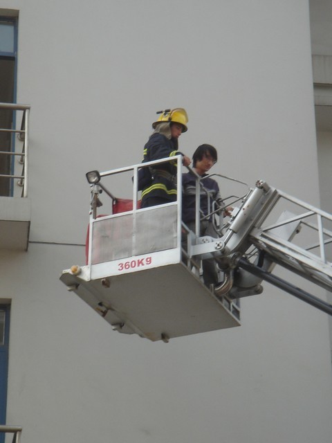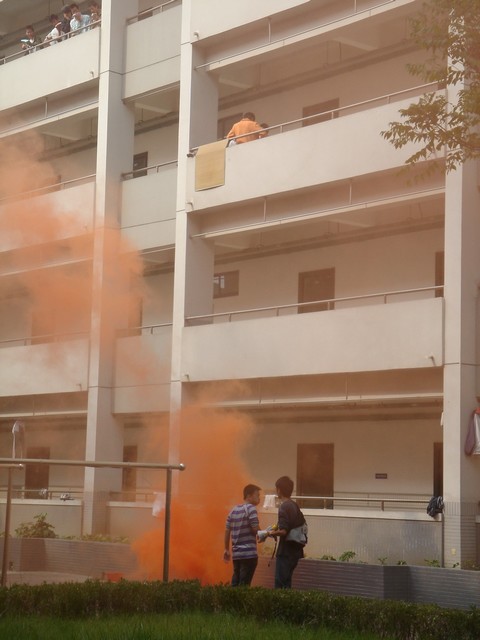 消防演习与紧急疏散为此次活动拉开序幕。11月5日12时45分,梅园一舍瞬间起火,整栋楼烟雾缭绕。楼上的员工开始迅速有序地从火灾现场撤离到安全地点。五分钟后消防车及时赶到,消防人员迅速接好水带,娴熟地操纵进水设备,不到几十秒水喷出,现场火势得到有效控制。此时,一名同学被困四楼,消防员迅速升高云梯,成功将困于四楼的一名同学救下。在模拟演习中,消防员严肃认真、迅猛沉着、机智干练的形象征服了现场的同学,赢得了一阵阵掌声与喝彩。随着收队哨声响起,消防车离开。