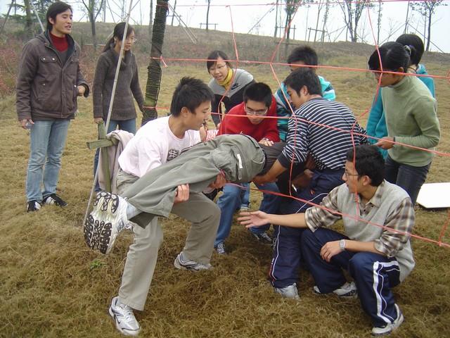 上午的“生死电网”与“盲人方阵”项目均以组为单位,分两地同时进行。其中,“生死电网”要求一组同学互帮互助共同穿越一张模拟的布满孔的电网,穿越期间不能有同学碰网,否则视为无效,并将接受一定的惩罚,且每个孔只能有两个人通过,限时40分钟。面对大小不一的孔,队员们从一开始紧张的讨论、七手八脚的试验,到略显缓慢的搬运,到最后时刻的沉着冷静、大胆细心,经历的不仅仅是一次模拟的生死穿越,更是一次力量、意志、应急能力以及同学间信任度的考验,最后两组队员都顺利地完成了任务,并交流了感悟。