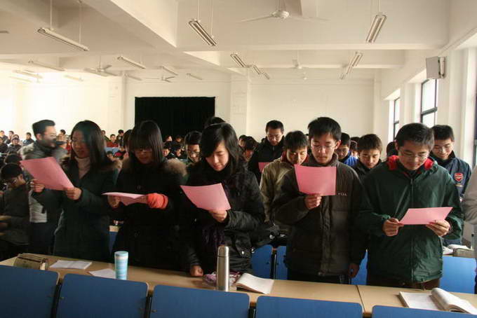 2008年12月23日至25日,bevictor伟德国际开展了以“我诚信,我成人”为主题的“诚信日”宣誓活动。宣誓会在昂扬激越的国歌声中开始,在领誓人带领下,学院06、07、08三个年级800余名本科生在国旗前庄严宣誓,充满人文情怀和启迪警示含义的誓词在现场久久回荡。宣誓结束,同学们郑重地在宣誓书上地签上姓名。
