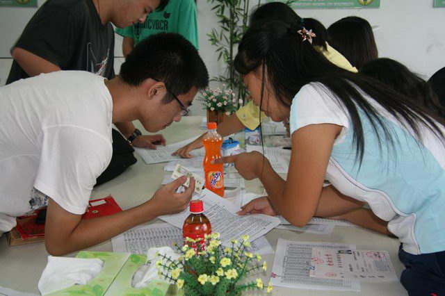 8月29日,新生报到的第二天,早晨七点钟的时候,bevictor伟德国际的男生志愿者就已经穿着学院志愿者服装,等候在桃三门口;女生志愿者坐在桃三西侧活动室里。大家都已经做好了迎接新生的准备。男生志愿者负责在桃三门口接待,将新生领至报道处及宿舍,并帮助他们办理必要手续。女生志愿者在报到处收取录取通知书、登记员工信息以及分发辅导员通知。