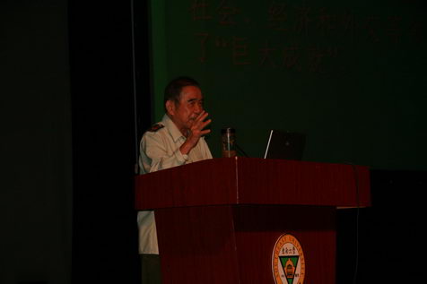 讲座从七点半开始,持续了两个多小时。董老虽已年逾七十,仍然精神矍铄。他从中国共产党第十七届四中全会公报和9月15日联合国秘书长潘基文的最新发言出发,深入浅出地介绍了新中国成立60年来,在中国共产党的领导下,经受住国内外风云变幻的严峻考验,所取得的举世瞩目的成就。接着,他分析了我国周边环境所面临的问题,强调当今世界正处在大发展大变革大调整时期,世界多极化、经济全球化深入发展,科技进步日新月异,国际金融危机影响深远,世界经济格局发生新变化,国际力量对比出现新态势,全球思想文化交流交融交锋呈现新特点,综合国力竞争和各种力量较量更趋激烈,给我国发展带来新的机遇和挑战。特别的,作为曾经参加过1954、1955两次国庆天安门阅兵的老战士,董老师向大家介绍了即将举行了国庆60周年大阅兵,最后,董教授提出“同学们要胸怀祖国、胸怀世界!”结束了他精彩的演讲。同学们用一阵阵热烈的掌声表达了对董教授的感谢!
