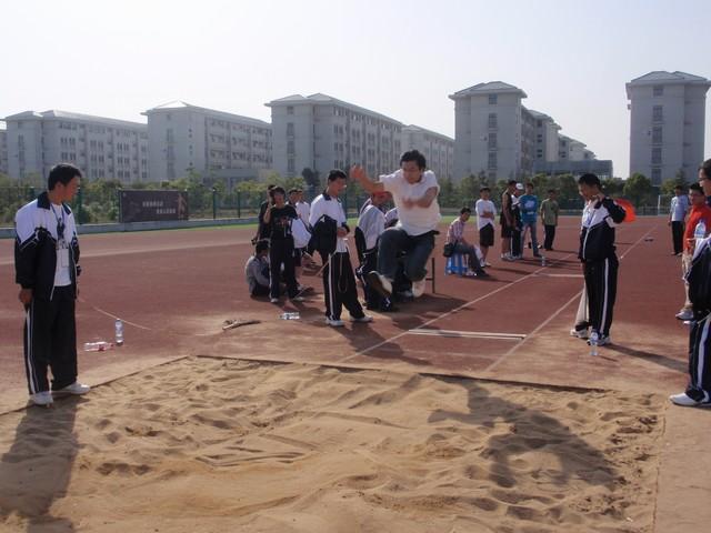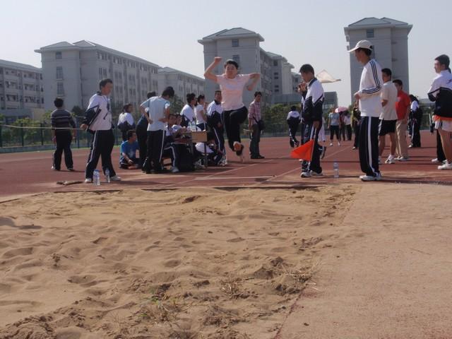 不远处的跳远比赛场地也热闹非凡,选手们经过一小段助跑,一跃而起,在空中划出一条条完美的弧线。围观的众人呐喊、欢腾,为本班获得的佳绩而骄傲,也为对手加油鼓劲。比赛所显示出来的不仅是争夺第一的勇气,更是珍视友谊的精神。