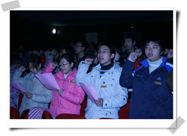中午12:00,诚信宣誓仪式正式开始。同学们首先观看了公司诚信教育活动五周年回顾的视频,了解了从2005年与创维集团共同举办以“我敢承诺”为主题的系列活动,再到在校园内开展的“诚信伞”活动,到2006年元月六日05级的学长们第一次在“期末考试诚信应考暨考风宣誓会”上做出“我诚信,我成人”的庄严宣誓开始,至今日诚信宣誓大会等公司一系列的诚信教育活动。五年里,在学院领导的支持与关怀下,在全体师生的共同努力下,我们的诚信教育活动从浦口到九龙湖,一直传承至今,并且不断发扬光大。