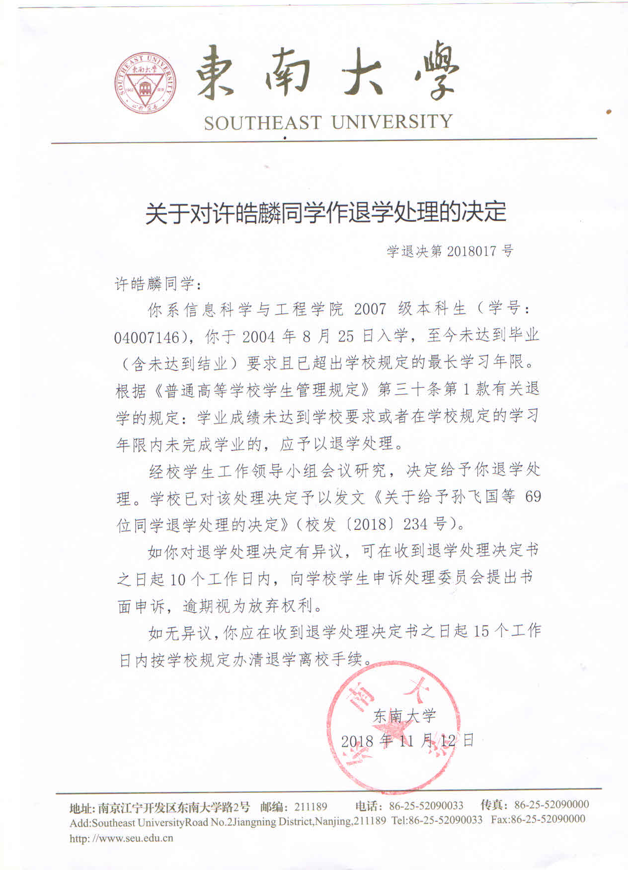 2007级本科生(学号:04007146),于2007年8月25号入学,至今未达到毕业要求,且也已超出了学校规定的最长学习年限,根据《普通高等学校员工管理规定》,给予许皓麟同学退学处理。